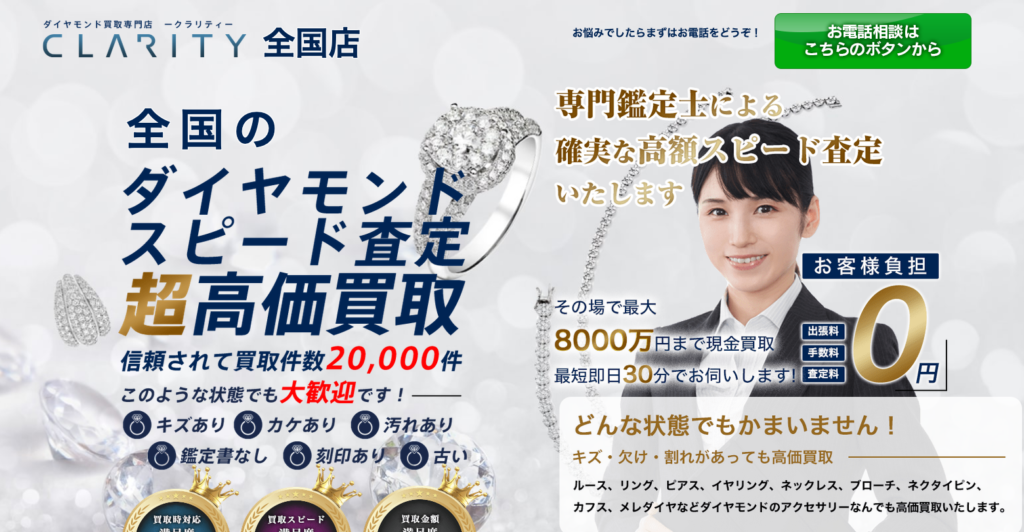 創業10年で、ダイヤモンドを専門に高額買取に特化した高額査定サービスがウリのクラリティ。最短即日30分でご自宅へ無料出張し、その日にその場で現金化できることが強みです。8,000万円まで現金買取対応可能!出張査定料や、キャンセル料、お客様負担0円... -