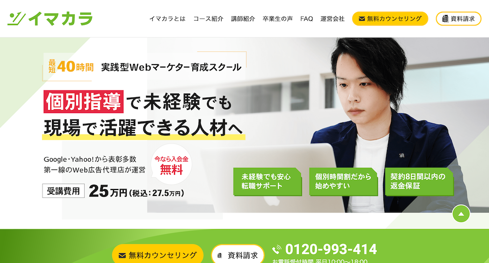 WEBマーケター育成スクールの「イマカラ」は未経験でも現場で活躍できる人材に!を表題に掲げる個別指導のオンラインスクールです。 未経験でも無料カウンセリングなどがありますので安心して取り組むことができます。 WEBマーケター育成スクール「イマカ... -